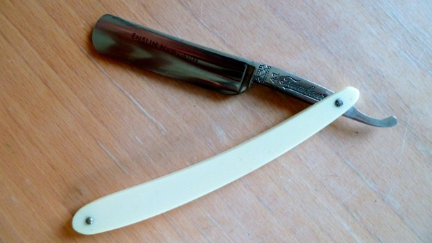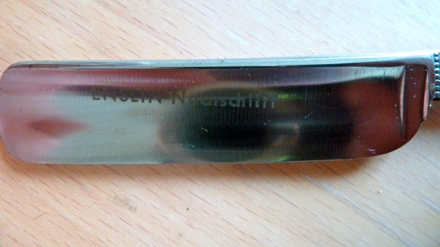 At an antique shop in Ravensburg I recently obtained some shaving related items which must come from the closedown of a barbershop in the area. The two Tambour straight razor blades were in absolute mint condition. After some stomping on the leather they were ready to shave. It took me some research to find out what “Enslin Nachschliff” means. A guy from the Nassrasur-Forum finally came up with the explination that: “… straight razor blades were quite expensive at those times, so when they went blunt they were given to a special craftsman who was specialized on resharping them…”. Thanks Master Enslin you did a great job.