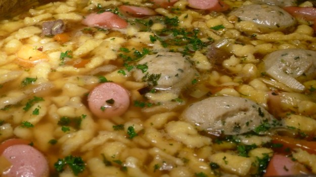 Yesterday we were invited by Caro&Frank for dinner. Frank a gifted chef and an amazing character prepared the perfect (I do not rate 100% so often) Gaisburger Marsch. The broth was reduced for hours and had a very rich flavour as the base for the soup. The onions, carrots, the handmade spätzle, the brätknödel, potatoes, the Wienerle (frankfurter sausages), and the meat were a perfect symphony of tastes and textures.