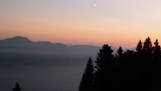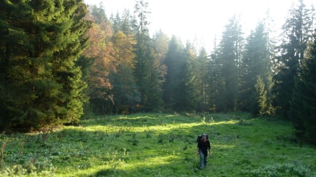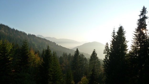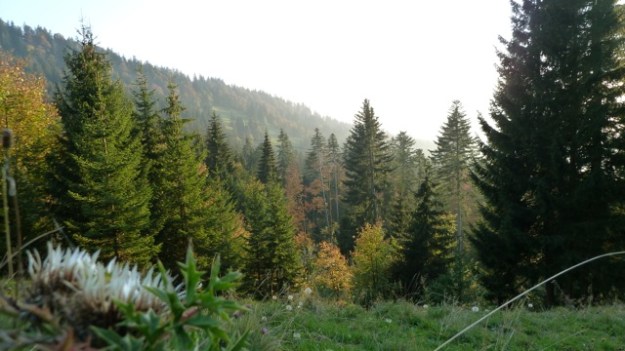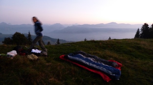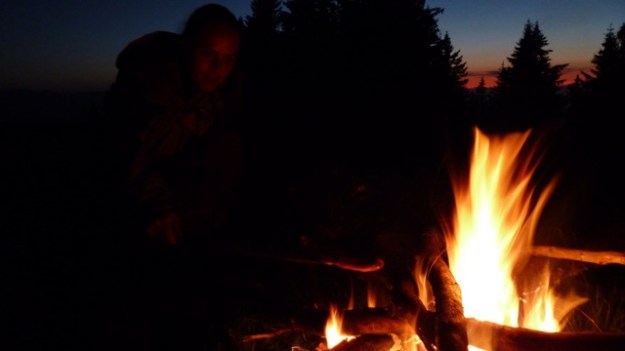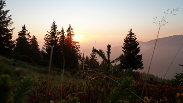 Last friday Maria and me went for camping straight after work. Before the temperature drops and snow comes, this might be the last time at higher altitude without the snowshoes. Weather-reports were great for the day/night so we only packed the bivouac bag, no tent and the sleeping bags. It was very evident that the indian summer/autumn was beginning much earlier up there, the leaves turn already yellow and brown. The hike to the “summit” was much longer than we thought, I would say about 2 hours. After we arrived I went straight to collect some wood for the fire while Maria prepared the camp. It quickly went dark and we had a great sunset. We roasted some sausages on sticks and had a bottle of bordeaux nouveau. At higher altitude and without the artificial light of cites, the stars are much more visible and brighter up there and the milky way looks like a cloud, so many stars you can see. When sleeping outdoors you tend to wake up more, but you really don’t mind if you see the stars above you. Next morning we woke up exactly at sunrise at about 7am (at least me) and I prepared some coffee with the bialetti. We had doubt that the sparkling water we brought might taste sour in the coffee – and yes it does. So another lesson learned.