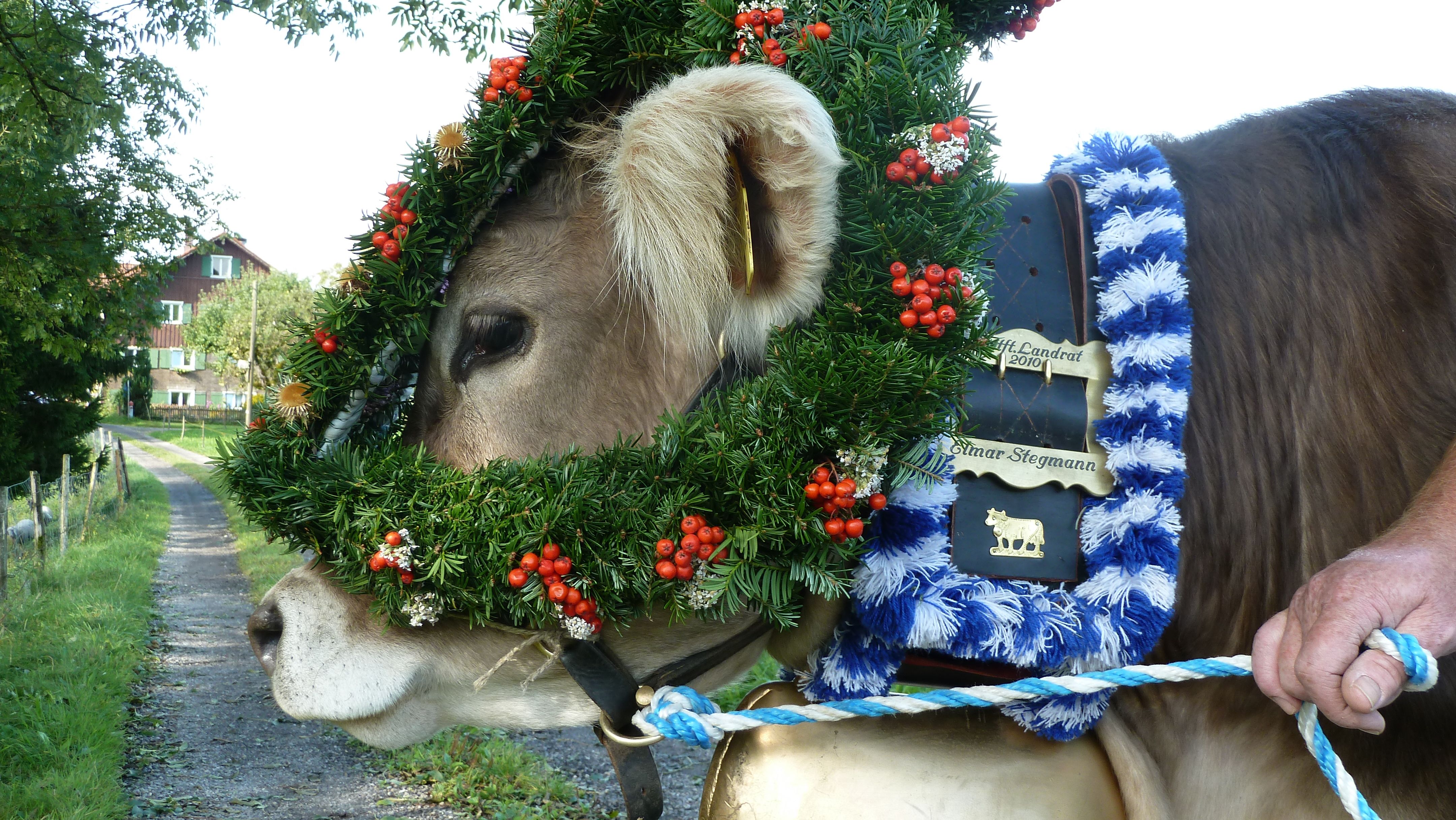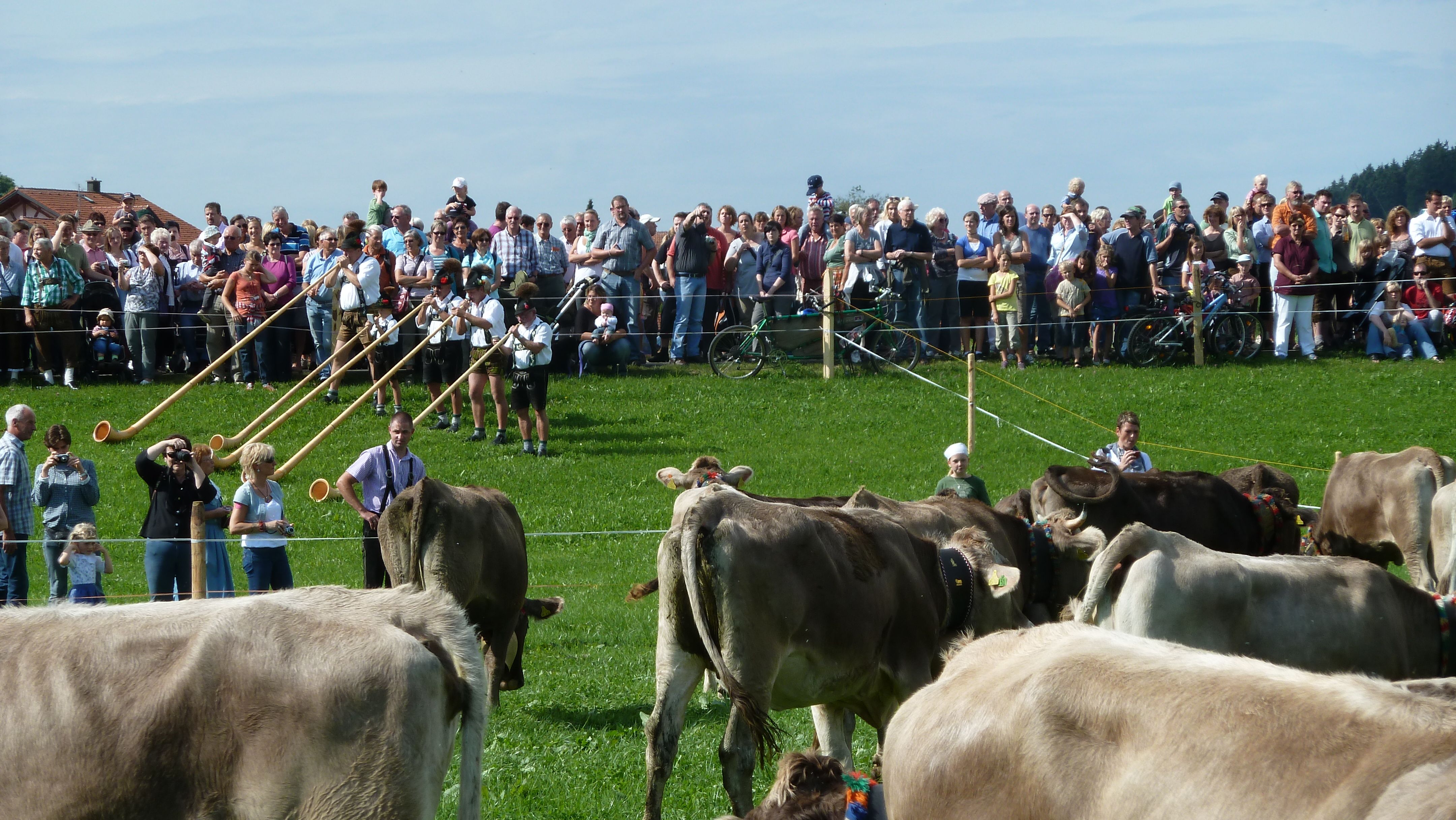 First of all I might have to explain what a “Viehscheid” is. A “Viehscheid” is the a synonym for “Almabtrieb” which is the bringing back of the cows from their summer alpine stay (before autumn and the risk of snow) to the sables in the lower valleys. The leading cows are decorated by traditional herbs and flowers – but only if no cow has died during their stay in the mountains. This photos I took in Maierhöfen Allgäu 2011, this is the Viehscheid with the longest distance of more than 30 kilometers, the cow train consists of about 200 – 250 cows.