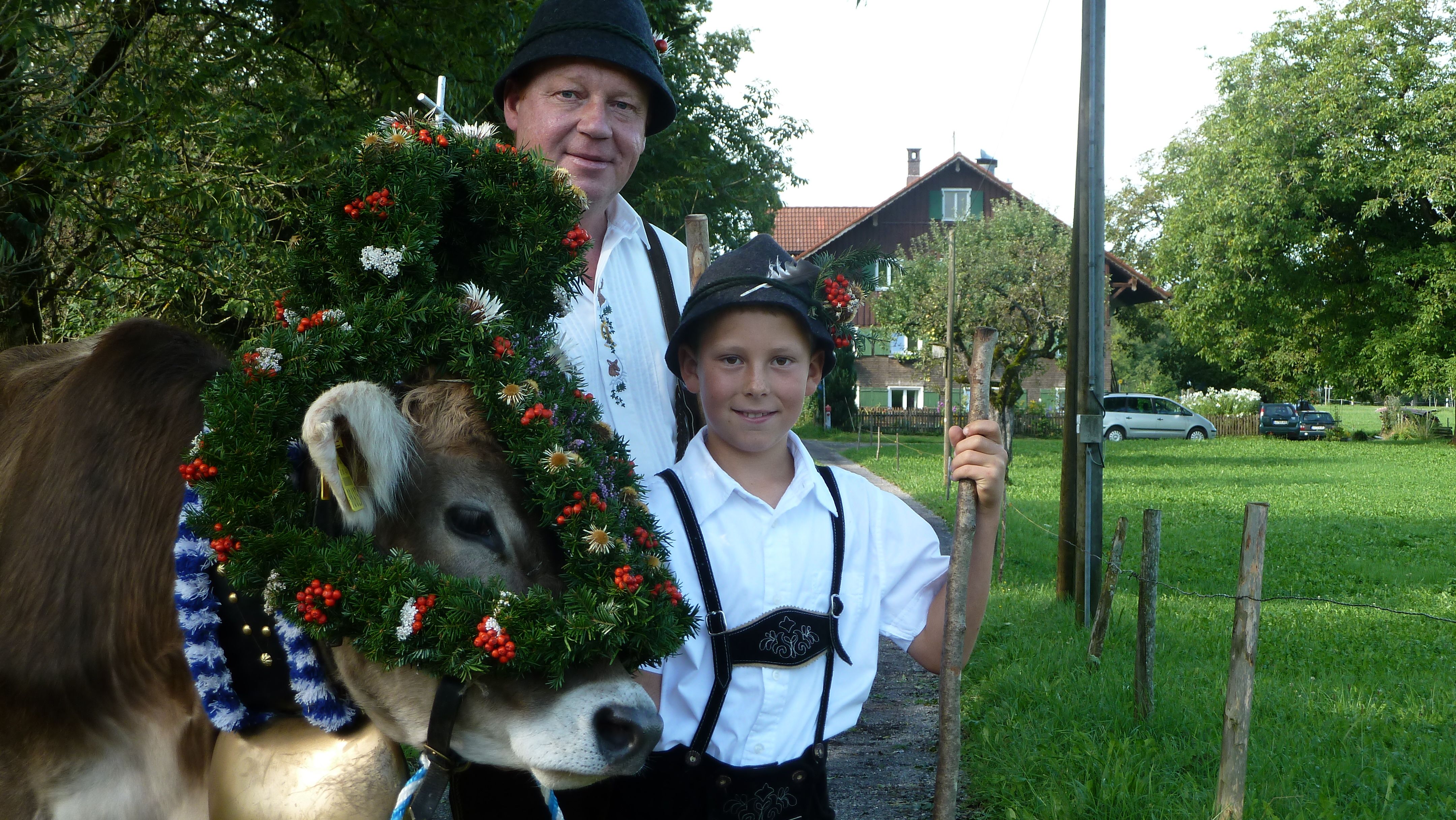 Viehscheid-Maierhoefen, decorated cow with owner and sonViehscheid-Maierhoefen, decorated cow with owner and sonViehscheid-Maierhöfen decoration of one of the leading cowsNow the train arrives