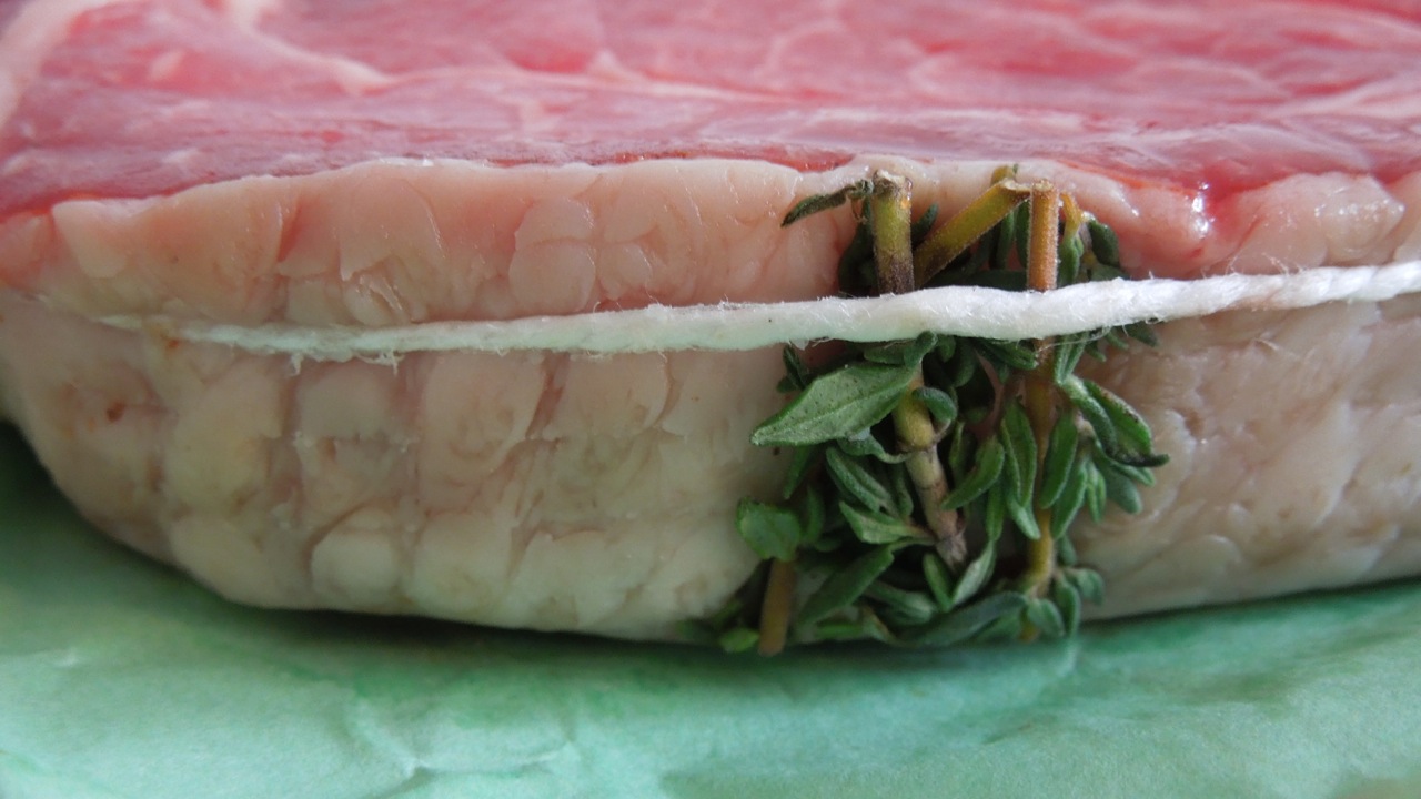 Visiting my local butcher today, I was a bit puzzled what kind of steak he is offering here. My first guess was right it is indeed a Rib Eye but he pimped it with some herbs and wrapped with an additional layer of fat. Proudly he insured me it will preserve the meats juiciness even more with an additional crispy rim. Thats how shopping is to be done, choose carefully, talk to the butcher and give him a feedback afterwards.