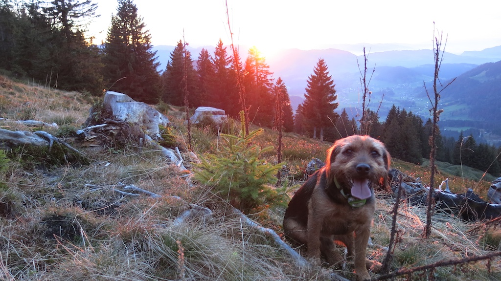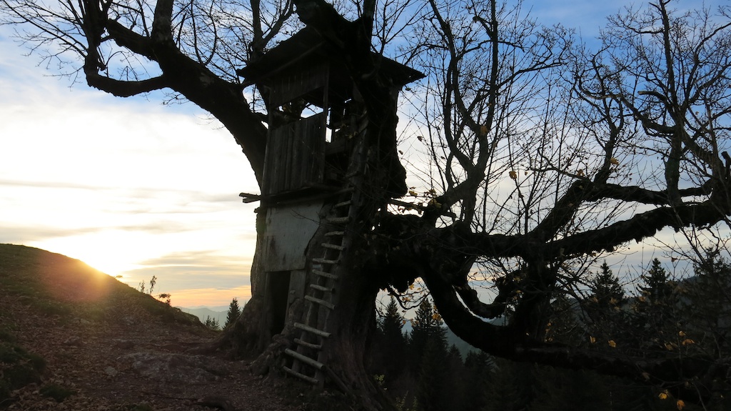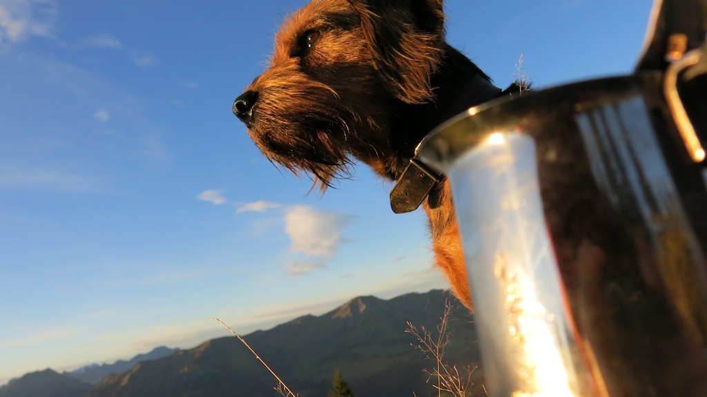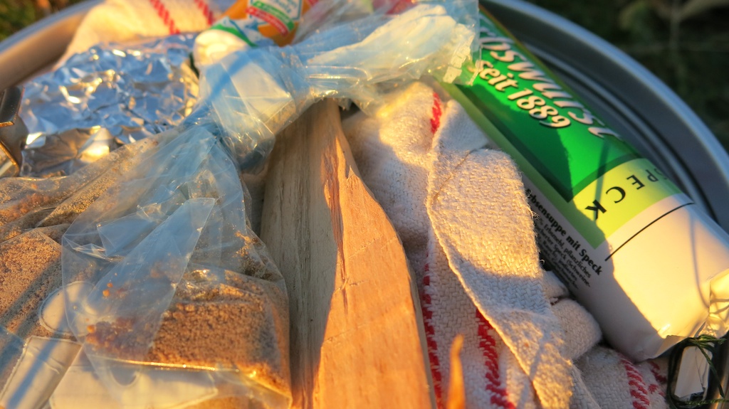 We probably caught one of the last weekends for our bivouac in the alps. Probably a week to late, the yellow leaves already dropped down. After about close to 3 hours we reached the summit and our campground. On the way up there I spotted a badly wounded tree which blood/resin I took as a fire starter. Two years ago I collected some wood and leaned it to a tree, it was still there so the fire was started really quick. We barbecued some Frankfurter/Kraken and had a good bottle of red wine.