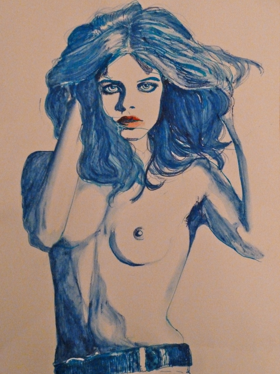 About 2 month ago I visited the ArtDesign Feldkirch which is an small but fast growing Design fair in Vorarlberg and saw a drawing from Maria Wallenstein after one of the famous photos of Uschi Obermaier. The original photos are too expensive and I really liked the way how Maria was drawing her. I bought the small “USCHI” and ordered a bigger one for me. Thanks to Maria from the Bauhaus University in Weimar.